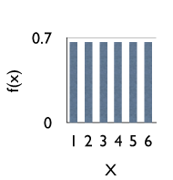 Esta função representa experiências como o lançamento de um dado (N = 6) e portanto \(f(x) = \frac{1}{6} \), para x = 1, 2, ...,6. Em termos gráficos temos