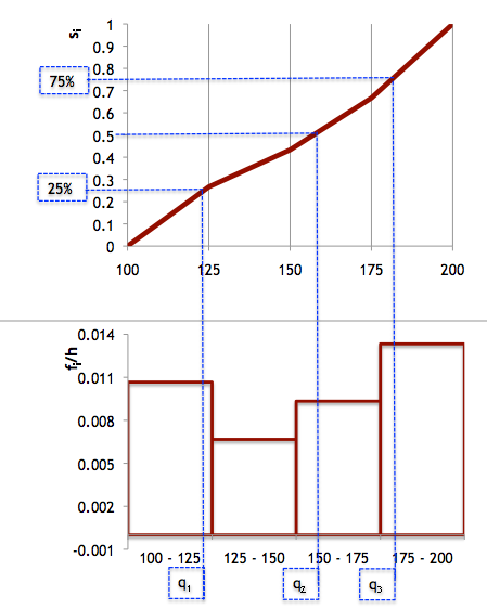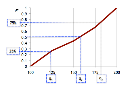 $$\frac{q_{2}-150}{175-150}=\frac{0.5-0.43(3)}{0.66(6)-0.43(3)} $$ $$q_{2}=157.14$$ $$\frac{q_{3}-175}{200-175}=\frac{0.75-0.66(6)}{1-0.66(6)}$$ $$q_{3}=181.25$$ Figura 5. Representação gráfica do cálculo dos quartis.